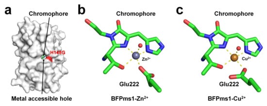 BFPms1 is an engineered fluorescent protein that uses a specific metal to bind GFP and alter its fluorescence signal [35]. To create the chromophore of BFPms1 as a metal ligand, such as porphyrin, Tyr66 (corresponding to the chromophore) was substituted with a histidine residue. In particular, Barondeau et al. have developed an H148G mutant to generate holes between β-strands for metal access (Figure 4a). Moreover, additional amino acid substitutions were performed to increase quantum yield (Y145F), improve solubility (F64L, F99S, M153T, and V163A), and promote rapid chromophore formation (S65T). The metal ion screening results showed that Cu2+ quenched the fluorescence emission whereas Zn2+ enhanced it. BPFms1 has a Kd of 24 μM and 50 μM for Cu2+ and Zn2+, respectively, whereas KD is greater than 2 mM for other transition metal ions [35]. The crystal structures of BFPms1 complexed with Zn2+ and Cu2+ were determined at a resolution of 1.44 and 1.50 Å, respectively. In Zn-bound BFPms1 (PDB code 1KYS), Zn2+ exhibited a trigonal bipyramidal geometry distorted by the chromophore Glu222 and water molecules (Figure 3b). In Cu-bound BFPms1 (1KYR), a square-planar geometry was exhibited by the amino acid Glu222 and the porphyrin of the chromophore (Figure 3c). The histidine ring of BFPms1 exhibited a metal bond shift and rearrangement of Glu222. Structural changes around the chromophore have been shown to occur depending on the type of metal ion bonded to the chromophore. However, it has not been clarified whether the fluorescence emission is changed by the conformational change of the chromophore or whether a metal is bound to the chromophore and has an effect. In this review, additional metal ions binding to the surface of β-can from coordinates deposited in PDB (PDB code 1KYR and 1KYS) were observed. In the BFPms1-Zn2+ structure, three additional Zn2+ ions interacted with the His25, Glu142, and Glu172 residues, whereas in BFPms1-Cu2+, Mg2+ ions interacted with Glu142 in the final model structure. In a structural study of BFPms1, only the metal around the chromophore was described [35], and further studies are required to determine whether the metal bound to the surface of BFPms1 affects fluorescence emission.