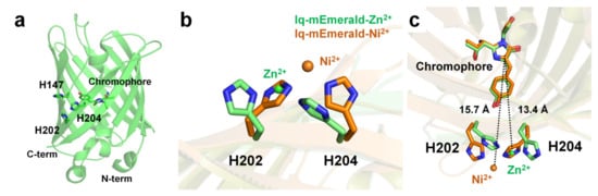 Two surface-exposed histidine residues separated by one residue of the β-sheet (i and i+2) create robust transition metal ion binding sites in proteins [95,105]. Using this protein engineering concept, Yu et al. have generated mutant constructs of mEmerald-1H (His147), mEmerald-2H (His202 and His204), and mEmerald-3H (His147, His202, and His204). In mEmerald-2H, two histidine residues are located on the same β10-strand [9]. In Emerald-3H, the His147 residue is located at the β7-strand, which is the closest neighbor position of the two histidine residues of mEmerald-2H. mEmearld-2H and mEmerald-3H showed strong fluorescent quenching for Cu2+ with a Kd of 0.3 and 0.2 μM, respectively, whereas wild-type mEmerald and mEemrald-1H showed weak (at high concentration) or low affinity (1–10 μM), respectively. Accordingly, Yu et al. have generated the most robust and sensitive mEmerald-3H mutant (iq-mEmerald) for Cu2+-induced fluorescence quenching. Physiological concentrations of Ca2+ (1 mM) and Mg2+ (10 mM) did not affect the fluorescence quenching behavior of iq-mEmerald. The engineered histidine motif of iq-mEmerald can bind specifically to other transition metal ions, such as Co2+, Ni2+, and Zn2+. The crystal structure of iq-mEmerald complexed with Ni2+ (PDB code 4KW8) and Zn2+ (4KW9) ions were determined at a resolution of 2.45 Å, and 1.80 Å, respectively (Figure 5a). Both Ni2+ and Zn2+ interacted with His202 and His204 of iq-mEmerald; however, the conformations of the side chains of the metal-interacting histidine residues differed (Figure 5b). In native iq-mEmerald, the side chains of His202 and His204 were in the direction opposite to the metal-binding site. In iq-mEmerald-Ni2+, the side chains of His202 and His204 were rotated toward the metal-binding site, and Ni2+ was coordinated by His202 and His204 at a distance of 2.08 and 2.04 Å, respectively. In contrast, in iq-mEmerald-Zn2+, the conformation of His202 was similar to the conformation of His202 in metal-free iq-mEmerald, whereas the side chain of His204 was rotated to Zn2+ ion. Zn2+ was coordinated by His202 and His204 at a distance of 2.01 and 2.00 Å, respectively. The closest distance between the imidazoline ring and metal-binding site for Ni2+ and Zn2+ was approximately 15.7 and 13.4 Å, respectively (Figure 5c). This result indicates that the metal-binding configuration and the distance between the metal ion and chromophore differ depending on the type of metal ion, although the metal-binding sites are the same.