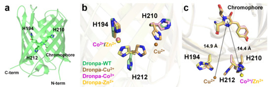 Dronpa is a photoswitchable green fluorescent protein isolated from the Echinophyllia sp. SC22 [85]. The Dronpa chromophore consists of a CYG tripeptide with maximum excitation and emission wavelengths of 503 and 518 nm, respectively [85]. The cysteine residue of the Dronpa chromophore is critical for its photoswitchable function [106]. The optical properties of metal-induced fluorescence quenching of Dronpa were screened using divalent ions such as Mg2+, Ca2+, Mn2+, Co2+, Ni2+, Cu2+, Zn2+, or Co2+ [98]. Cu2+ clearly exerted the strongest quenching effect on the fluorescence emission of Dronpa, and Co2+ reduced the fluorescence intensity, whereas other metal ions did not significantly affect the fluorescence intensity of Dronpa. The fluorescence intensity of Dronpa quenched by Cu2+ and Co2+ was reversible and recovered by 97% and 95%, respectively, upon the addition of an EDTA chelator. Dronpa naturally has three histidine residues (His194, His210, and His212) located on the surface of the β-barrel. The crystal structures of Dronpa complexed with Co2+, Ni2+, and Cu2+ had a resolution of 2.20, 1.90, and 2.85 Å, respectively. In the Dronpa-Co2+, the Co2+ interacted with the His194 and His212 residues at a distance of 2.21 and 2.26 Å, respectively, and showed distorted octahedral coordination along with four water molecules. In Dronpa-Ni2+, the Ni2+ interacted with the His194 and His212 residues at 2.12 and 2.19 Å, respectively, and showed distorted octahedral coordination along with four water molecules. Accordingly, the metal coordination features of Dronpa-Co2+ and Dronpa-Ni2+ were similar but distinct from those of the surrounding water molecules. The distance between Co2+/Ni2+ and the imidazoline ring of the chromophore was approximately 14.4 Å. In Dronpa-Cu2+, Cu2+ metal interacts with His210 and His212 at distances of 2.34 and 2.54 Å, respectively. However, the Cu2+-binding coordination was not clear because of the poor electron density map. The side chains of His210 and His212 were rotated to the Cu2+-binding site by 90° and 115°, respectively, compared with the native Dronpa structure. Accordingly, when Dronpa interacts with a metal, the histidine residue at the binding site undergoes a conformational rearrangement, indicating that the metal has a geometrically stable configuration. The distance between Cu2+ and the imidazoline ring of the chromophore is approximately 14.9 Å. In this study, the metals around the chromophore were described [98]; however, additional metal ions were present at the bottom of the β-barrel in the deposited crystal structure. In Dronpa-Co2+, -Cu2+, and -Zn2+, additional metal ions were bound to His200, and the side chain was exposed to the solvent (Figure 6a). Moreover, the distance between the imidazoline ring of the chromophore and His200 was approximately 19 Å. Accordingly, further experiments are required to determine whether the metal bound to His200 affects the fluorescence-quenching ability of Dronpa.