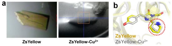 Crystallographic study of ZsYellow. (a) Color change of the ZsYellow crystal by Cu2+ solution soaking. (b) Comparison between the chromophore of the native and Cu2+-soaked ZsYellow. Original figures were obtained from a previous study [92] and modified.