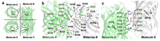 Although structural evidence for quenchable metal binding to DsRed has not been reported yet, biochemical and spectral analyses clearly show a Cu2+-binding site on DsRed. Eli and Chakrabartty investigated copper binding after chemical modification using iodoacetamide and diethyl pyrocarbonate (DEPC) of cysteine and histidine residues, respectively, to trace the Cu2+-binding site of DsRed [97]. As a result, Kd increased by >100 μM when treated with iodoacetamide, whereas no remarkable difference was observed upon treatment with DEPC [97]. This result indicates that the cysteine residue of DsRed is involved in Cu2+-binding [97]. Rahimi et al. investigated the mechanism of DsRed fluorescence quenching: far-UV CD spectral analysis showed no structural changes in the entire protein, even when DsRed was bound to a metal ion [103]. In addition, the UV-visible spectra and Stern–Volmer constant showed a static quenching mechanism during the interaction between DsRed and Cu2+ [103]. The crystal structure of DsRed showed a tetramer with 222 non-crystallographic symmetry [104] (Figure 3a).
