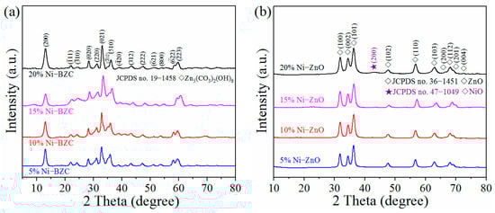 XRD patterns of (a) Ni-doped Zn5(CO3)2(OH)6 precursors and (b) Ni-doped ZnO products.