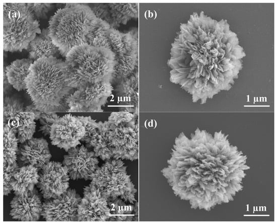 Representative SEM images of (a,b) the sea urchin-like 10% Ni-doped Zn5(CO3)2(OH)6 precursor and (c,d) the corresponding porous sea urchin-like Ni-doped ZnO.