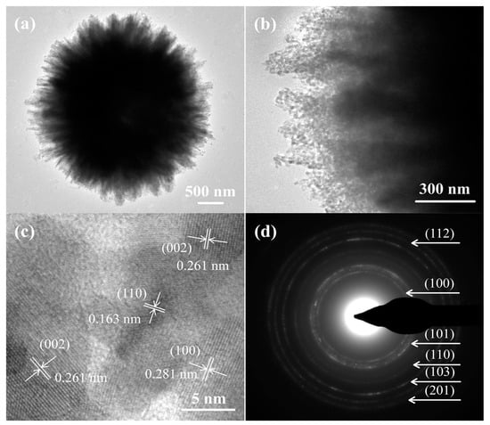 The detailed structure of 10% Ni-doped ZnO sea urchins was studied further by transition electron microscopy (TEM). Figure 3a–c presents the TEM and HRTEM images of the sample. The sample had a sea urchin morphology composed of numerous ultra-small nanoleaves. There were many irregular nanopores on the nanoleaves (Figure 3b). These pores of various sizes were produced by the decomposition of the Zn5(CO3)2(OH)6 precursor to CO2 gas and gaseous H2O, which can improve the sensing performance. The interplanar distances were 0.281, 0.261, and 0.163 nm, which correspond to the hexagonal phase of ZnO planes (100), (002), and (110), respectively (Figure 3c) []. Figure 3d shows the selected area electron diffraction (SAED) pattern of the sample, which can be assigned to the (100), (101), (110), (103), (112), and (201) planes of hexagonal ZnO []. The TEM results were consistent with the structural and morphological characteristics of the 10% Ni-ZnO sample obtained from XRD (Figure 1b) and SEM (Figure 2).