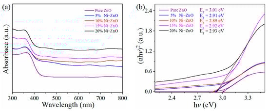 Figure 4a shows the UV-Vis spectra of the porous Ni-ZnO and pure ZnO sea urchins. There is a distinct absorption peak at ca. 360 nm. In addition, the absorption intensity of Ni-doped ZnO sea urchins was higher than that of pure ZnO sea urchins within the wavelength range of 300–800 nm. Moreover, the Tauc equation of αhv = C(hv − Eg)1/2 was applied to estimate the bandgap of pure ZnO and Ni-ZnO sea urchins. As shown in Figure 4b, the calculated bandgap of the 5%, 10%, 15%, and 20% Ni-ZnO sea urchins were 2.91, 2.89, 2.92, and 2.93 eV, respectively, which are smaller than that of pure ZnO sea urchins (3.01 eV). This suggests that introducing the Ni dopant in ZnO leads to less energy for the electronic transition than the pure ZnO sea urchins. Compared with the pure ZnO sample, the decrease in the bandgap of Ni-doped ZnO samples is due to the formation of energy levels of the 5D4 state of Ni2+ under the 3F4 state of Zn2+, i.e., immediately decreasing the conduction band of the ZnO sample [].