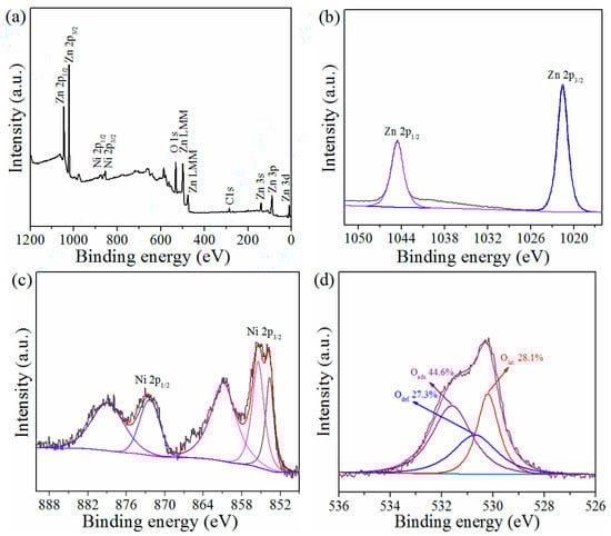 XPS spectra of porous urchin-like Ni-ZnO composites: (a) survey spectrum, (b) Zn 2p, (c) Ni 2p, and (d) O 1s spectra.
