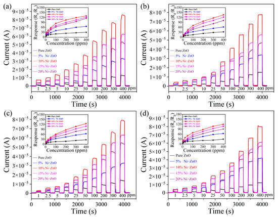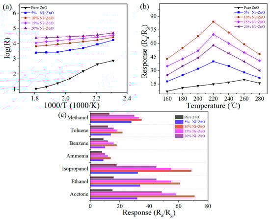 Figure 6a shows the changes in resistance (Ra) of the ZnO and Ni-doped ZnO sea urchin sensors. The working temperatures started from 140 °C to 260 °C. With regard to all the prepared sensors, the Ra value of the sensors decreases as the operating temperature continues to rise. The temperature dependences of the resistance of the obtained samples followed a linear function. The more abundant electrons were forced into a conductance band of the sensing materials activated by the sufficient energy provided by the high temperatures []. So, as is well known, the gas sensors belong to the type of surface-controlled one based on the curves changes of resistance temperatures. Under the same working temperature, the Ra sequence of the prepared sensors was present as follows: 20% Ni-ZnO > 15% Ni-ZnO > 10% Ni-ZnO > 5% Ni-ZnO > pure ZnO. This was mainly due to the effect of Ni dopants which can introduce oxygen-related defects []. As the Ni-doped content of the ZnO increases, the crystal size of ZnO decreases and more oxygen molecules are adsorbed on the ultra-small ZnO nanoleaves, forming oxygen ions. In air, these increasing oxygen ions could capture more electrons from ZnO, leading to the higher resistance of the Ni-ZnO sensing film. Furthermore, when the amount of Ni dopants is high, the appearance of NiO and the formation of NiO–ZnO p–n junctions would also increase the resistance of the Ni-ZnO sensing film.