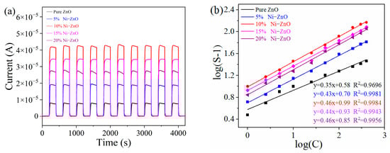 (a) Current change curves of the 10% Ni-ZnO sensor upon exposure to 100 ppm formaldehyde vapor for 10 tests at the optimal working temperature (220 °C). (b) Linear relationship of the response to different concentrations of formaldehyde.