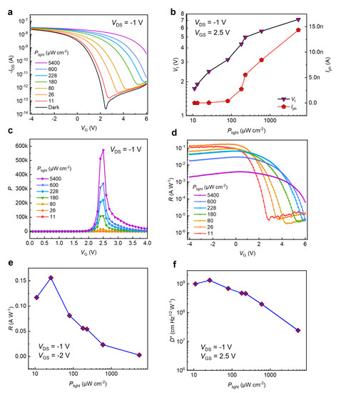 Photoresponse of the fully-printed OPTs. (a) Typical transfer curves of a fully printed OPT in the dark and under light illumination with various intensities. (b) Photocurrent and threshold voltage as a function of the light intensity. Photosensitivity (c) and photoresponsivity (d) as a function of gate voltage under different light intensities. Light intensity-dependent photoresponsivity (e) and specific detectivity (f) of the OPT.