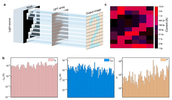 Imaging function demonstration. (a) Schematic diagram illustrating the device arrangement of the OPT array for imaging function. (b) Distribution of the dark, photocurrent, and photosensitivity of the fully printed device array. (c) Reconstructed image of “2” by the OPT array.