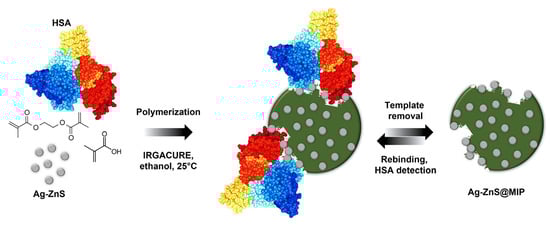 A schematic for the synthesis of human serum albumin (HSA)-imprinted Ag-ZnS@MIP composite receptors.