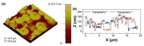 (a) A micrograph of the receptor layer showing Ag-ZnS microspheres, (b) topographic surface profiles of the receptor layer showing surface features from bottom-to-top (Topography a) and across right-to-left (Topography b) of surface in (a).
