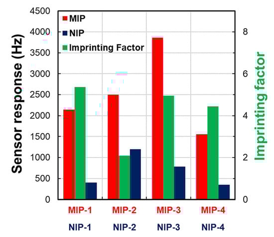 Sensor responses and imprinting factors of QCM devices coated with different MIP formulations. Imprinting factors are calculated by dividing the respective MIP and NIP sensor shifts.