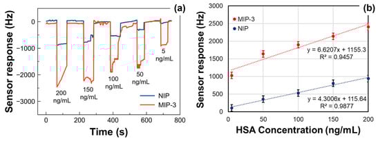 The sensor shifts of Ag-ZnS@MIP and Ag-ZnS@NIP coated QCM devices on exposing different HSA concentrations ranging from 5 to 200 ng/mL are shown in Figure 6a. It can be noticed that the drop in frequency of Ag-ZnS@MIP coated QCM for 200 ng/mL of HSA is about 2410 Hz, while for Ag-ZnS@NIP, the drop in frequency is 940 Hz. The appreciably higher sensor shifts of the MIP layer are attributed to tailored affinity sites for has recognition, which are generated by the molecular imprinting process. It is proposed that the optimized amounts of MAA and EGDMA for MIP formation could yield geometrically and chemically adapted interaction sites for HSA recognition through a range of non-covalent interactions. Moreover, the incorporation of Ag-ZnS microspheres in MIP coating could also contribute to increased sensor shifts for HSA sensing. The sensor shifts resulting from the NIP layer could only be due to the non-specific binding interactions between polymer surface and analyte molecules, and, thus, NIP coatings could be taken as control.
