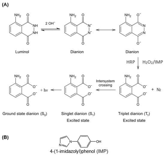 - Dotsikas, Y.; Loukas, Y.L. Employment of 4-(1-imidazolyl)phenol as a luminol signal enhancer in a competitive-type chemiluminescence immunoassay and its comparison with the conventional antigen–horseradish peroxidase conjugate-based assay. Anal. Chim. Acta 2004, 509, 103–109. [Google Scholar] [CrossRef]