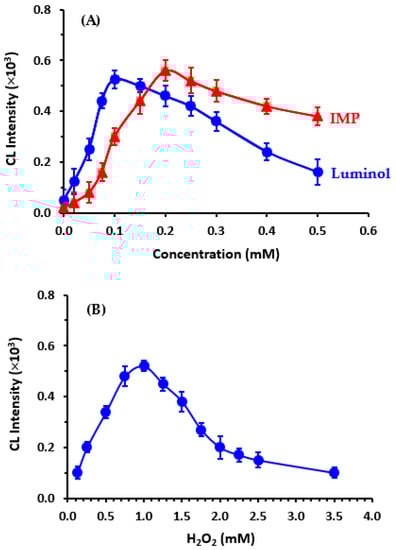 Effect of concentrations of luminol, IMP (A) and H2O2 (B) on the CL intensity induced by HRP-luminol-H2O2-IMP reaction. The values are mean of 3 determinations ± SD.