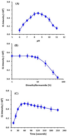 In general, the kinetic profile of the CL-producing reaction depends on the rate of generation of the CL-emitting species and also the rate of formation of the final product [46]. The CL emission usually reaches its maximum value quickly subsequent to reaction initiation, remaining stable for a while and then declining slowly due to the decay of the species in the excited state to that of the ground state under these analytical conditions. For construction of an assay with the highest possible sensitivity, the measurements should be performed at the time of maximum CL signal and before a significant decay. In the current work, the kinetic profile of the enhanced CL-reaction was evaluated by monitoring the CL signals for 210 s from the reaction initiation. It was found that the maximum CL signals were obtained in the time range of 45–75 s, then started to decline slowly (Figure 4C). Besides, measuring the signals at 60 s gave better reading precision (lower RSD values). In light of these findings, all future investigations assessed CL signals at 60 s.