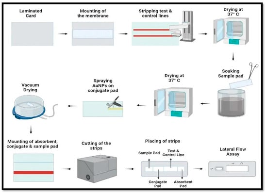 Step-by-step protocol of LFA engineering. Beginning with a laminated card, Mounting of membranes; stripping test and control line settings; Drying at thirty degree Celsius; vacuum drying; Spraying of gold nano-particles on conjugate pad; Drying again; Soaking sample pad; Mounting of absorbent, conjugate, and sample pads; strip cutting; strip placing inside plastic cover; LFA ready (adopted) [15].