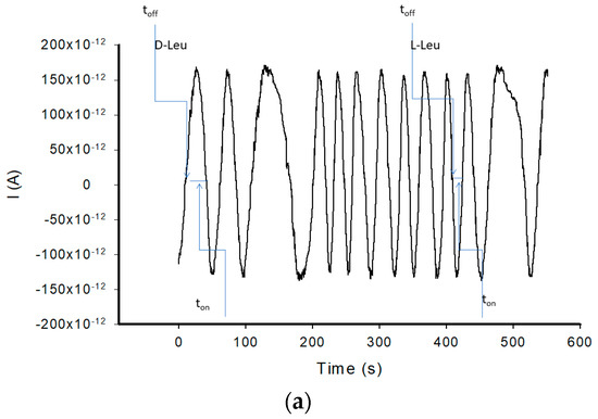 Due to the complexity of the matrix of whole blood, and the low levels of leucine enantiomers in whole blood, the stochastic sensors were selected as new screening tools. Stochastic sensors are known for their reliability recorded in the biomedical analysis of different biological samples (whole blood, saliva, urine, tumoral tissue, cerebrospinal fluid) when amino acids [2,3,4] or proteins [17,18,19] were analyzed. They are able to perform qualitative analysis—for identification of the enantiomer [2,3,4,20,21,22,23,24]—when the signature of the enantiomer (toff value) is used, and also a quantitative analysis by using the ton value measured in between two signatures (toff values) (Scheme 1); they are also able to identify the stereochemistry of a compound, and also, they are able to distinguish the amino acids from a DNA chain.