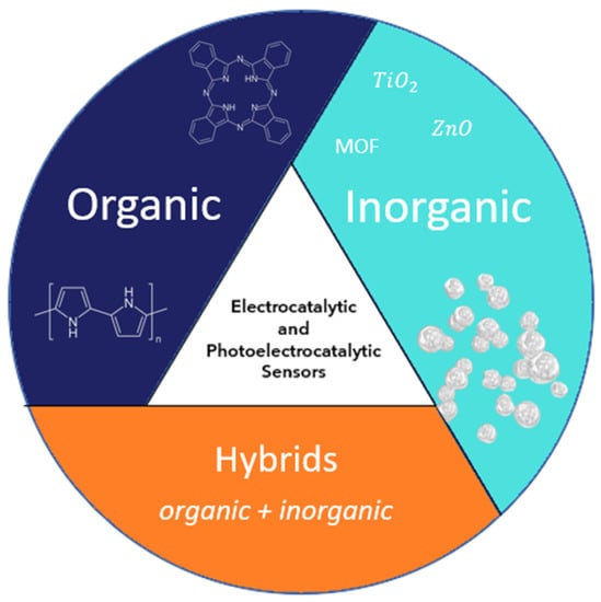 In this review, we discuss the main fundamentals of sensing by electrocatalysis and photoelectrocatalysis, using sensors based on organic, inorganic, and hybrid materials. This review will provide a guide for researchers summarizing the options available for applying sensor detection using different substrates. Figure 2 provides a summary diagram of the topics covered in the article.