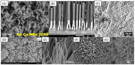 SEM image of (A) Au-Co NRs on a 3D nickel foam (reprinted with permission from Ref. [23]); (B) cross-section of completely homogeneous Ni NWs (reprinted with permission from Ref. [26]); (C) leaf-templated Co3O4 (reprinted with permission from Ref. [27]); (D) Fe2(MoO4)3 sample (reprinted with permission from Ref. [28]); (E) CuO nanoarray (reprinted with permission from Ref. [29]); (F) TiO2 nanorods (reprinted with permission from Ref. [30]); (G) NiO@Ni-MOF on Ti mesh (reprinted with permission from Ref. [31]).