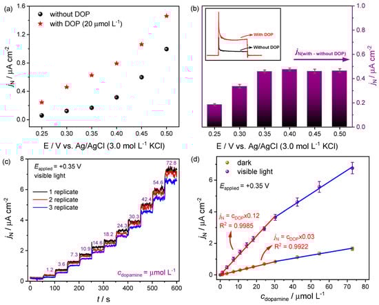 - Camargo, L.P.; Pelissari, M.R.D.S.; da Silva, P.R.C.; Batagin-Neto, A.; Medeiros, R.A.; Dias, M.A.; Dall’antonia, L.H. Visible Light Photoelectrochemical Sensor for Dopamine: Determination Using Iron Vanadate Modified Electrode. Molecules 2022, 27, 6410. [Google Scholar] [CrossRef] [PubMed]