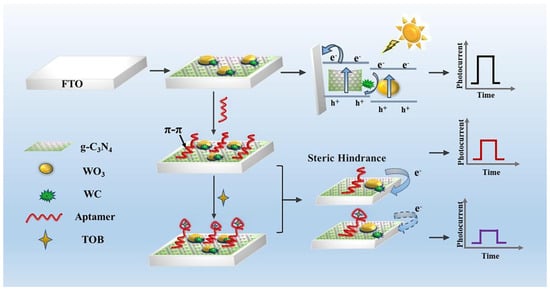 - Qiao, L.; Zhu, Y.; Zeng, T.; Zhang, Y.; Zhang, M.; Song, K.; Yin, N.; Tao, Y.; Zhao, Y.; Zhang, Y.; et al. “Turn-off” photoelectrochemical aptasensor based on g-C3N4/WC/WO3 composites for tobramycin detection. Food Chem. 2023, 403, 134287. [Google Scholar] [CrossRef]