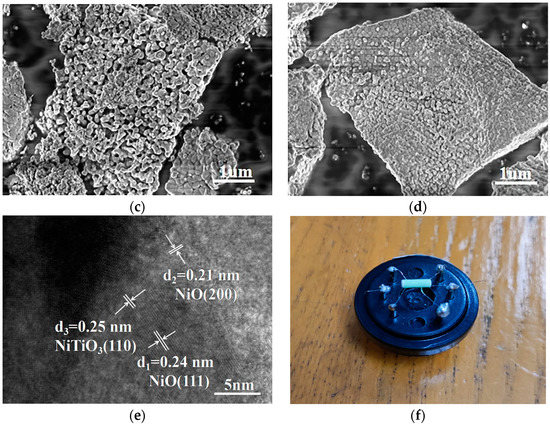 SEM images of (a) NiO; (b) 2% NiTiO3-NiO; (c) 10% NiTiO3-NiO; (d) 25% NiTiO3-NiO. HRTEM image of (e) 10% NiTiO3-NiO. (f) Physical image of NiO sensor.