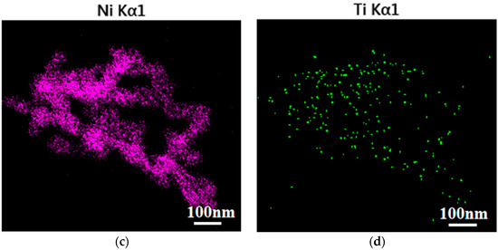 The chemical composition of the material was analyzed by EDS, as shown in Figure 5b. The results show that 10% NiTiO3-NiO fully contained O, Ni, and Ti elements, and there was no interference from other clutter elements. The content percentages of O, Ni, and Ti elements are shown in Figure 5b.