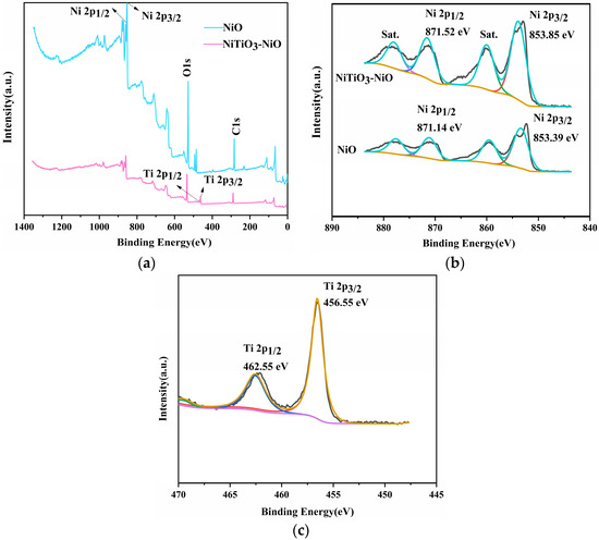 As shown in Figure 6b, the Ni 2p spectrum of pure NiO had two main peaks at 871.14 eV and 853.39 eV. Due to spin site splitting, the two peaks belonged to Ni 2p1/2 and Ni 2p3/2, respectively. The peak binding energies of Ni 2p1/2 and Ni 2p3/2 in 10% NiTiO3-NiO samples were 871.52 eV and 853.85 eV, respectively, while those in pure NiO samples were 871.14 eV and 853.39 eV, respectively. There were two main peaks in the Ti 2p spectrum of 10% NiTiO3-NiO. Due to spin site splitting, the two peaks belonged to Ti 2p1/2 and Ti 2p3/2, respectively. The Ti 2p1/2 and Ti 2p3/2 binding energy peaks were 462.55 eV and 456.55 eV, respectively. After adding NiTiO3, the peak value of binding energy shifted, which was the result of electronic interaction.