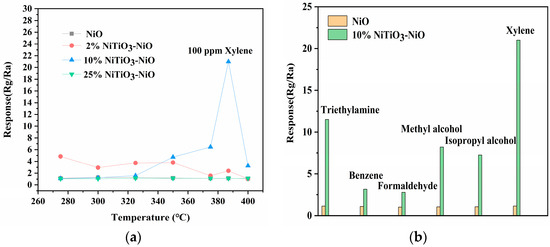 As shown in Figure 7a, the curve of 10% NiTiO3-NiO rose and then decreased, with the highest response value at 387 °C. The main reason was that when the operating temperature was poor, the xylene gas molecules were underactive, and did not get enough energy for the reaction. As the operating temperature increased, the surface reaction between xylene and the oxygen adsorbed on the surface was accelerated, leading to an increase in the response value. However, when the temperature was too high, the xylene molecule received too much energy and the vibration caused it to be difficult to adsorb on the sensor surface, causing the response value to decrease. The maximum response value at 387 °C reached 23, which was much higher than that of unmodified NiO (1.13). The sensitivity of the material to xylene was significantly improved after modification with NiTiO3. In Figure 7a, the results suggest that the presence of NiTiO3 could greatly improve the performance of the NiO sensor in detecting xylene, which might be due to the more uniform internal distribution and larger specific surface area of the 10% NiTiO3-NiO sensor. This improved performance might be due to the introduction of NiTiO3, which increased the average pore size of the 10% NiTiO3-NiO sensor so that oxygen molecules and xylene gas molecules could enter the material more quickly and promote the reaction.