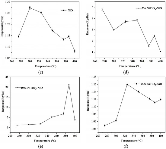 (a) Optimal operating temperature curves for NiO, 2% NiTiO3-NiO, 10% NiTiO3-NiO, and 25% NiTiO3-NiO sensors. (b) Response of NiO and 10% NiTiO3-NiO sensors to different gases at 100 ppm. Optimal operating temperature curves for (c) NiO; (d) 2% NiTiO3-NiO; (e) 10% NiTiO3-NiO; (f) 25% NiTiO3-NiO sensors.