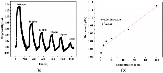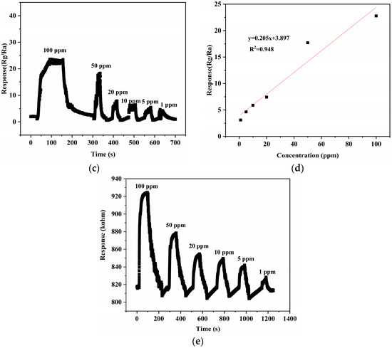 In addition, based on the excellent performance of the 10% NiTiO3-NiO sensor for xylene gas, its dynamic response curves for different ppm xylene gases were also investigated in Figure 8. When the xylene gas concentration increased, the response value of the sensor also increased. In addition, the results were fitted. The relationship between gas concentration and response value was linear, which shows that the sensor had a great positive detection range and good stability.