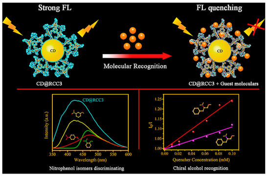 Compared with traditional labeling materials, quantum dots are characterized by high fluorescence intensity, diverse luminous colors, and a wide spectrum range. Moreover, quantum dots are suitable for multiple spatial and spectral transmission, effective attenuation, and elimination of background fluorescence effects. Due to their superior properties, quantum dots have become highly effective fluorescent probes used for numerous applications. In 2019, Lu et al. constructed a fluorescence sensor to identify nitrophenol isomers using a chiral carbon-point hybrid porous organic cage nanocomposite (CD@RCC3) (Figure 2) [66]. This nanocomposite has a large void volume, stable fluorescence, and good solubility in organic reagents. In addition, the chiral isomers can be directly identified by simple host–guest interactions, and as a result, a quick and simple detection is achieved. In 2019, Masteri-Farahani et al. modified chiral colloidal CdSe quantum dots (CdSe-QDs) with cysteine enantiomers to regulate the optical properties of the quantum dot core and functionalize it [67]. The composite material has strong interactions with l-morphine and can quench its fluorescence, enabling the novel fluorescence sensor to selectively identify l-morphine.