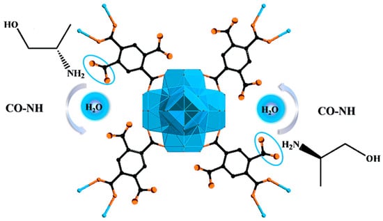 Metal–organic frameworks (MOFs) are novel supramolecular materials with large surface areas, abundant structures, and adjustable pores, and their abundant luminescence center has a good application prospect in fluorescence sensing analysis. In 2020, Xiao et al. functionalized the chiral s-1/r-1 UiO-66-(COOH)2 with l/d-amino propanol to construct homochiral metal–organic frameworks (HMOFs) (Figure 3) [68]. The incompatibility of the HMOF assembly was simplified, and the fluorescence sensors constructed with s-1 (l-AP@UiO-66-(COOH)2) and r-1(d-AP@UiO-66-(COOH)2), respectively, showed enhanced fluorescence signal intensity with the phenylalanine enantiomer. This fluorescence sensor exhibits significant enantioselectivity.