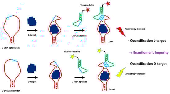 It is well known that nucleic acids with high affinity and specificity can be used as chiral aptamers to bind to target substrates (through base pairing), so as to achieve chiral recognition. In 2019, Chovelon et al. reported the measurement of enantiomers using the aptamer kissing complex (AKC) (Figure 5) [71]. In this case, the arginine vasopressin enantiomers processed l/d-DNA as an aptaswitch and l/d-RNA labeled with Texas red and luciferin as hairpin probes (aptakiss). As shown by the results, the fluorescence anisotropy signal was enhanced when the aptaswitch and the hairpin loop–loop interacted. The sensor simultaneously monitored l/d-arginine vasopressin and detected enantiomer impurities as low as 0.01%. This study successfully extended the range of kiss assembly strategy to DNA-based chiral analysis and provided a very valuable strategy for the construction of supramolecular chiral sensors.