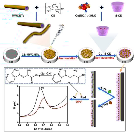 Macrocyclic compounds are excellent receptor molecules used to produce supramolecular effects. Among the various macrocyclic compounds, cyclodextrin has raised significant research interest among many researchers due to its excellent host molecule properties similar to those of enzymes. Various organic compounds can be embedded in the hydrophobic cavity of cyclodextrin to form an inclusion complex, which changes the physical and chemical properties of the envelope [99]. Therefore, it is possible to crosslink cyclodextrin molecules with various functional groups or polymers and perform chemical modification or polymerization using cyclodextrin as a monomer [100,101]. In 2018, Liang et al. constructed an electrochemical sensor on the electrode surface by coupling β-cyclodextrin to form a composite material on 3D graphene [102]. Then, the cavity of β-cyclodextrin was used as the binding site to establish host–guest interactions on the tryptophan enantiomer. As the binding force of l-tryptophan is much higher than that of d-tryptophan, the specific recognition of tryptophan enantiomers can be achieved. In 2019, Niu et al. modified β-cyclodextrin to form a composite material through the self-assembly of ferrocene and GO to construct an electrochemical sensor [103] and identified phenylalanine enantiomers through host–guest interactions, in which l-phenylalanine exhibited a higher affinity than d-phenylalanine. In addition, Cu2+ was independently assembled into a composite material after coordination with β-cyclodextrin and carboxymethyl cellulose, and it was fixed on the electrode modified with N-mixed 3D reduced GO to construct an electrochemical sensor [104] that recognized l/d-tryptophan through different degrees of binding. In 2019, Yi et al. also constructed an electrochemical sensor (Figure 11) by modifying carbon nanotubes coated with reduced GO on the electrode surface and then fixing β-cyclodextrin coated with rhodamine B on the electrode surface [105]. Through the competitive host–guest interaction between rhodamine B and phenylalanine enantiomers, β-cyclodextrin was easily bonded to l-phenylalanine; thus, the selective recognition of phenylalanine enantiomers was achieved. In 2020, Zou et al. prepared chiral composite materials with 6-O-α-maltose-functionalized β-cyclodextrin and fixed them on an electrode modified with a black phosphorus nanosheet [106]. The constructed sensor could recognize l/d-tyrosine enantiomers. In 2021, Gong et al. modified ammonium chitosan and carbon nanotubes on the electrode surface via self-assembly and then fixed Cu2+ on the electrode after coordination with β-cyclodextrin to create a sensing interface (Figure 12) [107]. They were able to selectively detect tryptophan enantiomers with the constructed electrochemical sensor. In 2021, Ebrahimi et al. reported the construction of an electrochemical sensor using β-cyclodextrin encapsulated in methylene blue composites [108], which could identify naproxen enantiomers through competitive host–guest interactions between methylene blue and the target molecule in chiral cavities. In 2022, Hou et al. reported a self-assembly formed by the electrooxidation of β-cyclodextrin on an electrode modified with chiral MOFs [109]. The constructed electrochemical sensor had multiple chiral recognition sites and could recognize tryptophan and penicillamine enantiomers. In 2022, Gao et al. synthesized a thiophene copolymer with cyclodextrin in a side chain (Figure 13) [110]. This copolymer has good conductivity and chiral selectivity and can be used to construct an effective electrochemical chiral sensor to recognize amino acid enantiomers.