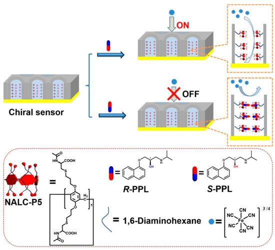 Nanomaterials have been widely used in electrochemical sensing due to their unique properties, including excellent electrochemical performance, high surface areas, and adjustable conductivity. In 2018, Yang et al. used a 10-camphorsulfonic acid enantiomer for peroxidation polymerization to form polypyrrole, resulting in a spiral polypyrrole chain with a left-handed and right-handed chiral microenvironment [111]. The constructed electrochemical sensor can specifically recognize l/d-tryptophan enantiomers. In 2018, Zhang et al. used cellulose nanocrystals as chiral units functionalized with multiwalled carbon nanotubes to form a composite material to construct an electrochemical sensor [112]. The host–guest effect of the composite material on l-tryptophan was stronger than that of d-tryptophan, which allowed the sensor to selectively recognize and identify tryptophan enantiomers. In 2019, Pu et al. reported the enantiomeric separation of (6,5)-single-walled carbon nanotubes to construct a single chiral electrochemical sensor to selectively recognize 3, 4-dihydroxyphenylalanine enantiomers [113]. In 2019, Stoian et al. constructed an electrochemical sensor on a glassy carbon electrode modified with l-cysteine-functionalized AuNPs [114]. Their results showed that compared with a single AuNP compound, the functionalized nanocomposites enabled the selective recognition of the chiral drug propranolol as a result of the different degrees of host–guest interaction. In 2020, Lian et al. synthesized a dendritic gold nanomaterial [115] and used it to construct an electrochemical sensor that could amplify the chiral recognizability of guest molecules through a differential pulse method and specifically identify 3,4-dihydroxyphenylalanine enantiomers (Figure 14). In 2021, Jiang et al. introduced the polymerization of non-chiral phthalocyanine into l-lysine helical nanofibers to form a chiral microenvironment [116], and the electrochemical sensor constructed using the composite nanomaterials could identify tryptophan enantiomers. In 2021, Liu et al. self-assembled synthetic chiral ionic liquid and N-doped GO multiwall carbon nanotubes onto the electrode surface to prepare chiral composite nanomaterials [117]. Compared with the electrode without composite multiwall carbon nanotubes, the electrochemical sensor based on composite materials further amplified the chiral recognition signal of the target molecule for the specific detection of tryptophan enantiomers. In 2021, Yu et al. constructed a chiral composite material into N-acetyl-l-cysteine-functionalized pillar[5]arene, and then solidified the composite material onto a polycarbonate (PC) membrane to form nanochannels [118]. Ultimately, the modified PC membrane was fixed on a gold electrode to construct an electrochemical sensor (Figure 15). The chiral nanochannel had a stronger host–guest effect on s-propranolol that significantly reduced the electrochemical signal of the constructed sensor; however, it had no significant host–guest effect on R-propranolol and selectively recognized the propranolol enantiomer. In 2022, Li et al. synthesized helical AuNPs with intrinsic chirality to construct electrochemical chiral sensors [119]. l/d-helicoid Au nanoparticles specifically bound to l/d-tyrosine to produce an enhanced electrochemical signal.