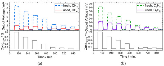 In Figure 1, the gas sensor signal as the output voltage of fresh Au–Pd@meso-Co3O4 catalyst to different concentrations of (a) methane, and (b) propane at 400 °C is shown in comparison to the signal of the used catalyst. When comparing the output voltages of Figure 1a with that of Figure 1b, it is visible that the oxidation of propane induces a considerably higher sensor signal than methane of the same concentration, e.g., five times higher for 1% gas concentration. The reasons for that are the higher standard reaction enthalpy for propane oxidation (2220 kJ/mol) compared to methane oxidation (890 kJ/mol) and the higher reactivity of propane for catalytic oxidation as well [34]. Moreover, Figure 1 reveals a remarkable decrease in the sensor signal for the used Au–Pd@meso-Co3O4 catalyst for both gases, although the baseline maintains stability.