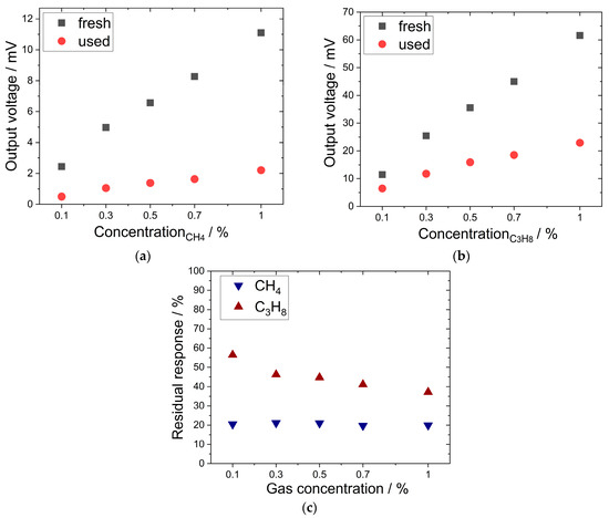 Concentration-dependent pellistor average response of meso-Co3O4 for fresh (black) and used material (red) to (a) methane, and (b) propane at 400 °C. Concentration-dependent residual response of meso-Co3O4 (c) to methane and propane. Methane and propane concentrations were 0.1%, 0.3%, 0.5%, 0.7% and 1%.