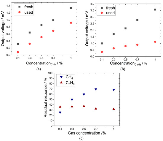 To simplify the data representation, Figure 2 illustrates the average gas sensor response of fresh and used Au–Pd@meso-Co3O4 catalyst to various concentrations of both gases as well as the concentration-dependent residual response measured at 400 °C. The residual response (in %) was calculated from the relation between the average gas sensor response of the used and fresh catalyst. The pellistor demonstrates an almost linear concentration dependency of average gas sensor response for fresh Au–Pd@meso-Co3O4 catalyst to methane (Figure 2a) and propane (Figure 2b) in a concentration range between 0.1 and 1%. The linearity of the concentration dependency is maintained for both gases after a long-term operation, although an unexpectedly high decrease in the sensor sensitivity is observed, indicating considerable aging of the catalyst. The output voltage is decreased from 11.1 mV to 2.2 mV for 1% of methane and from 61.6 mV to 22.9 mV for 1% of propane, demonstrating that the sensitivity of the sensor to methane is more impaired than to propane due to higher signal drop. This evidences that the reaction sites of high activity, which are necessary for methane oxidation, are more affected by the aging process than the sites of moderate activity sufficient for propane oxidation [24,35]. That is confirmed by an examination of the residual response (Figure 2c). For increased methane concentration, the residual response of Au–Pd@meso-Co3O4 remains unchanged at the same low value of 20%. In the propane measurement, as the concentration increases, the residual response reduces from 56% for 0.1% C3H8 to 37% for 1% C3H8, indicating that the oxidation of high propane concentrations becomes less effective on the used catalyst. Such an oxidation behavior of the Au–Pd@meso-Co3O4 catalyst could be explained by a strongly decreased concentration of highly active sites needed for methane oxidation in the process of catalyst aging. The moderately active sites are less influenced; however, their activity is not enough for the effective oxidation of high propane concentrations.