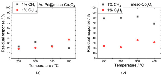 Figure 4a,b imply that the residual response of both materials depends only scarcely on the operation temperature. The slight response fluctuation could partially be caused by the measurement uncertainty and continued aging of the catalysts. The residual response of Au–Pd@meso-Co3O4 to methane and propane is similar at all temperatures and is in the range between 20% and 38%. The meso-Co3O4 exhibits an unusually high residual response to methane in the range between 70% and 85% but a low residual response to propane in the range between 20% and 35%.