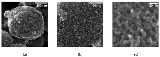 However, in contrast to the Au–Pd@meso-Co3O4, the meso-Co3O4 support exhibits a lower degree of degradation (Figure 6d–f). The mesoporous structure is still intact, although a slight degradation of the mesoporous structure at the surface is also observed. The higher remaining specific surface area of meso-Co3O4 coincides with the higher remaining oxidation activity to methane. The strong adsorption of intermediates of propane oxidation (fouling) on the active sites explains well the higher degree of catalyst deactivation for propane oxidation [40]. Fouling can happen by testing with propane at low operating temperatures of 200 °C and 250 °C, where the catalyst is less active, and the oxidation process is not complete [36]. The fouling is not recognizable by the SE-STEM examination.