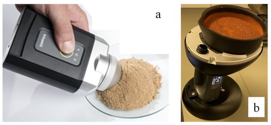 Examples of sample presentation for diffuse-reflection measurements of soil: (a) manual operation with an LVF NIR scanner (trinamiX, Ludwigshafen, Germany); and (b) rotating-dish accessory of the MEMS FT-NIR scanner (Si-Ware Systems, Cairo, Egypt).