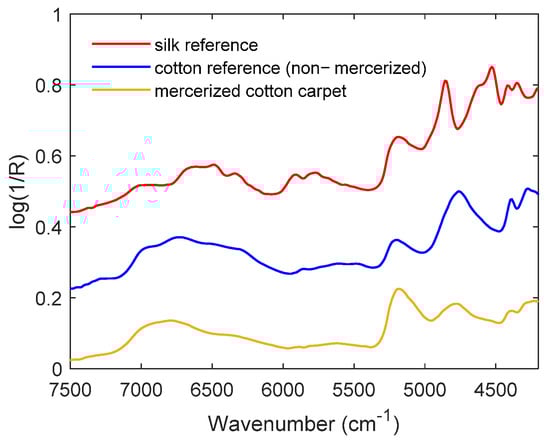 Prices of textiles (natural materials—cashmere, silk, cotton, etc.; or synthetic materials—polyamide, acrylic, polyester, etc.) vary widely, and fraudsters often sell low-quality materials to gullible customers at unreasonably high prices. For example, mercerized cotton, which has a shiny feel, is used to make fake silk carpets, quilts, and scarves. However, this deception can be easily avoided using handheld NIR spectroscopy by simply comparing reference spectra with the spectrum of the material tested on-site (Figure 3). Therefore, even non-expert users can quickly identify or authenticate products of interest by handheld NIR spectroscopy in combination with an easy-to-use evaluation model for specific materials.