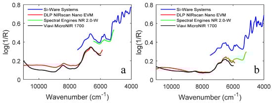 NIR spectra of two selected representatives of the investigated textile species ((a) cashmere wool, (b) silk) recorded with the four different handheld NIR spectrometers. Reproduced (CC-BY 4.0 license) from [].
