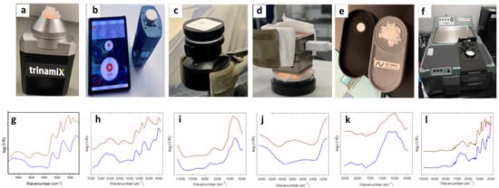 Sample presentation for spectra recording with the different NIR instruments. Top row: (a) trinamiX scanner, (b) NeoSpectra scanner, (c) Viavi MicroNIR 1700, (d), Spectral Engines NR 2.0-W, (e) SenoCorder Solid, and (f) Thermo Antaris II benchtop instrument. Bottom row: (g–l) the spectra of pure cotton (blue) and pure silk (red) recorded with the corresponding instruments above. Reproduced (CC-BY 4.0 license) from [].