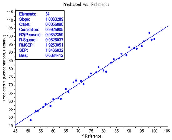 Actual/predicted plot of 34 test samples demonstrating the feasibility of an NIR spectroscopic on-site test for the determination of the silk content in quilts.