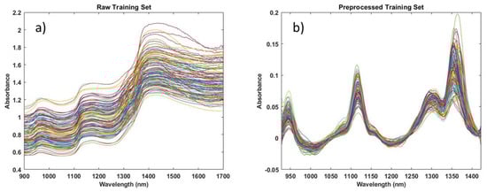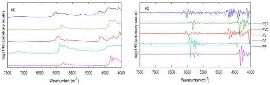 Comparison of the original spectra (a) of selected representatives of the five polymers measured using the NeoSpectra scanner and (b) the corresponding spectra after pre-treatment by 2nd derivative and SNV. Reproduced (CC-BY 4.0 license) from [].