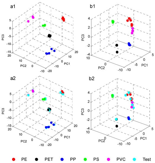 Figure 8a1,b1 shows the PCA score plots for the first three PCs of the five polymer commodities measured by the two spectrometers. In Figure 8a2,b2, the same score plots with the inclusion of the test samples (cyan dots) are shown. It is demonstrated that the MEMS based FT-NIR spectrometer (NeoSpectra) with a large wavenumber range can clearly distinguish the five polymers and successfully assigns the test samples to the correct clusters. However, the Fabry Perot tuneable filter instrument (NIR One) failed to separate PE and PVC (Figure 8b1,b2, red and magenta dots) because of its limited wavenumber range and reduced significant spectral features.